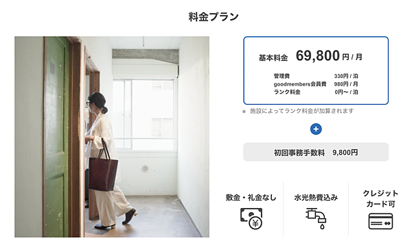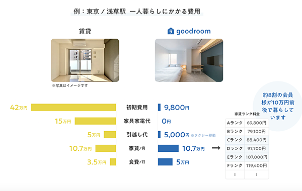 相較於在日本搬一次家的費用,goodroomサブスくらし的優勢就在於省去昂貴的初期費用(押金、禮金、保證金、保險、仲介、鑰匙更換等等),只需支付首次手續費9800日幣。也不用另外簽約網路(日本的租屋不一定有附免費無限網路),當然也就不用購買傢俱家電。而唯一比較多的開銷會用在外食的費用,不過大部分飯店都有共用的微波爐、冰箱與簡易廚房可下廚,因此若想節省伙食費也不成問題。